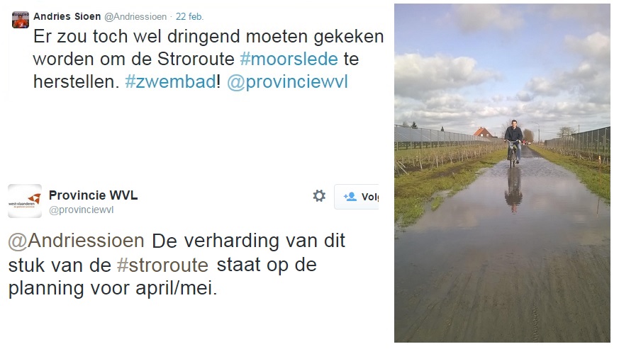 De voorbije maanden en weken kreeg ik heel wat opmerkingen over de staat van het wegdek van de Stroroute ter hoogte van Moorslede. Heel wat mensen waren erg lovend over de Stroroute op zich maar hadden toch wel heel wet opmerkingen over de staat van het wegdek. Zelf mocht ik ook ondervinden dat het niet altijd evident was om met de voeten op het droge te blijven.  Op verschillende plaatsen is de Stroroute een echt veldritparcours. Veldrijden mag dan wel tot één van de meest populaire sporten van Vlaanderen behoren. Veel mensen zien het toch niet zitten om deze sport zelf dagelijks te moeten beoefenen.