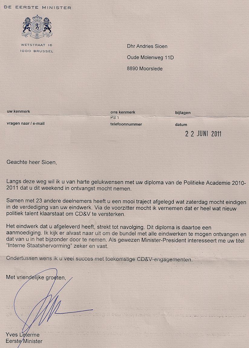 Vorige week studeerde ik af aan de poltieke academie met een eindwerk over de interne staatshervorming. Dit was blijkbaar ook onze premier Yves Leterme niet ontgaan. Vandaag mocht ik dan ook per post persoonlijke felecitaties van hem ontvangen. (De brief vind je verderop terug) Ik moet zeggen dat ik toch wel even verrast was, een mens krijgt toch niet elke dag post van de premier. De politieke academie is trouwens voor iedere jonge politicus een echte aanrader. Dit project van CD&V om te investeren in zijn jongeren lag een tijdje stil maar er werd een tweetal jaar terug door Wouter Beke nieuw leven ingeblazen. Ik wil via deze dan ook nog eens CD&V bedanken die mij deze kans geboden heeft om mij op tal van zaken te vormen en mijn blik heeft helpen verruimen.
